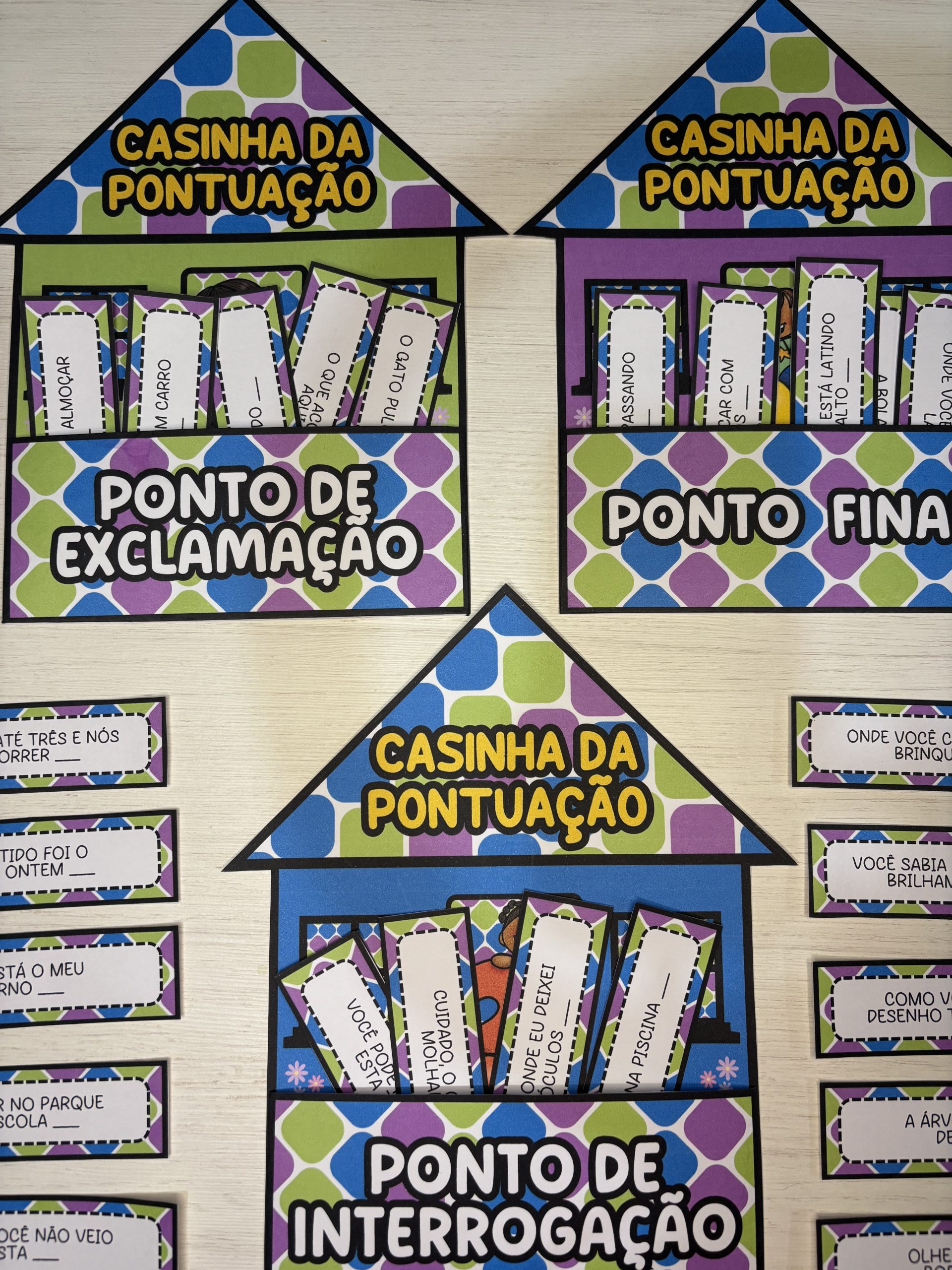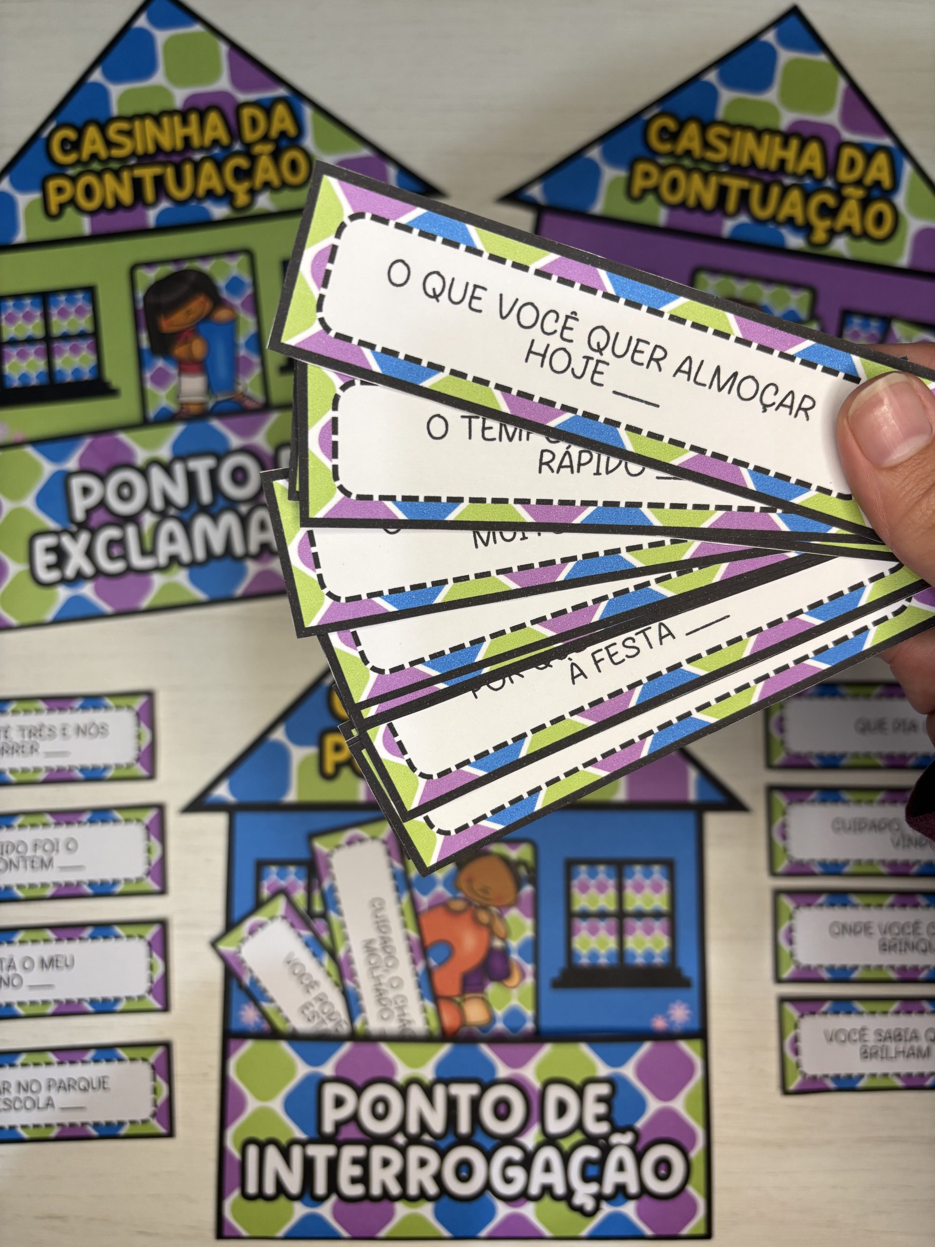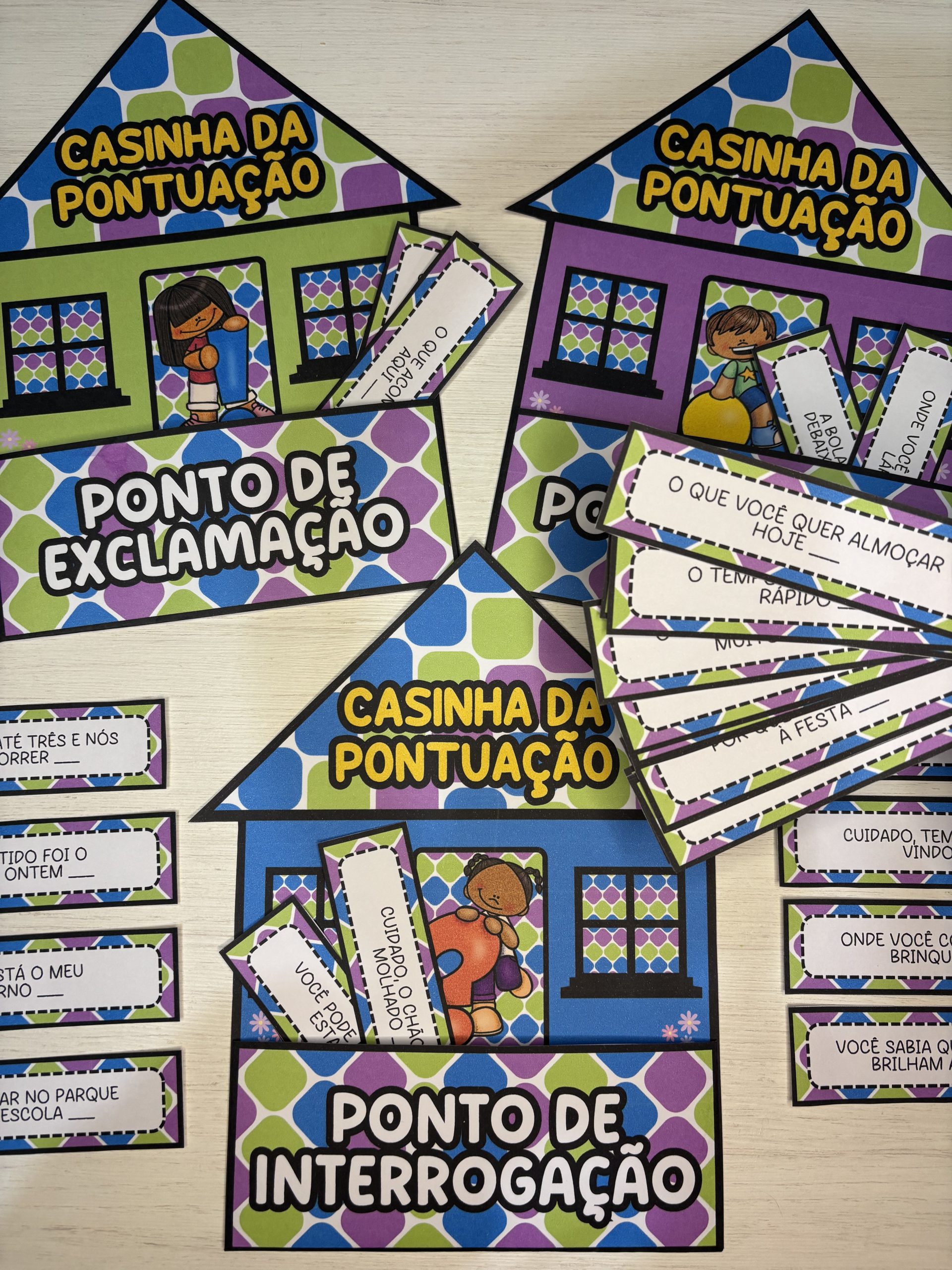 Após a identificação, as crianças podem colocar as fichas em suas respectivas casinhas 🏠🌻💬 Uma forma prática e envolvente de ensinar entonação, sentido e estrutura textual desde cedo.