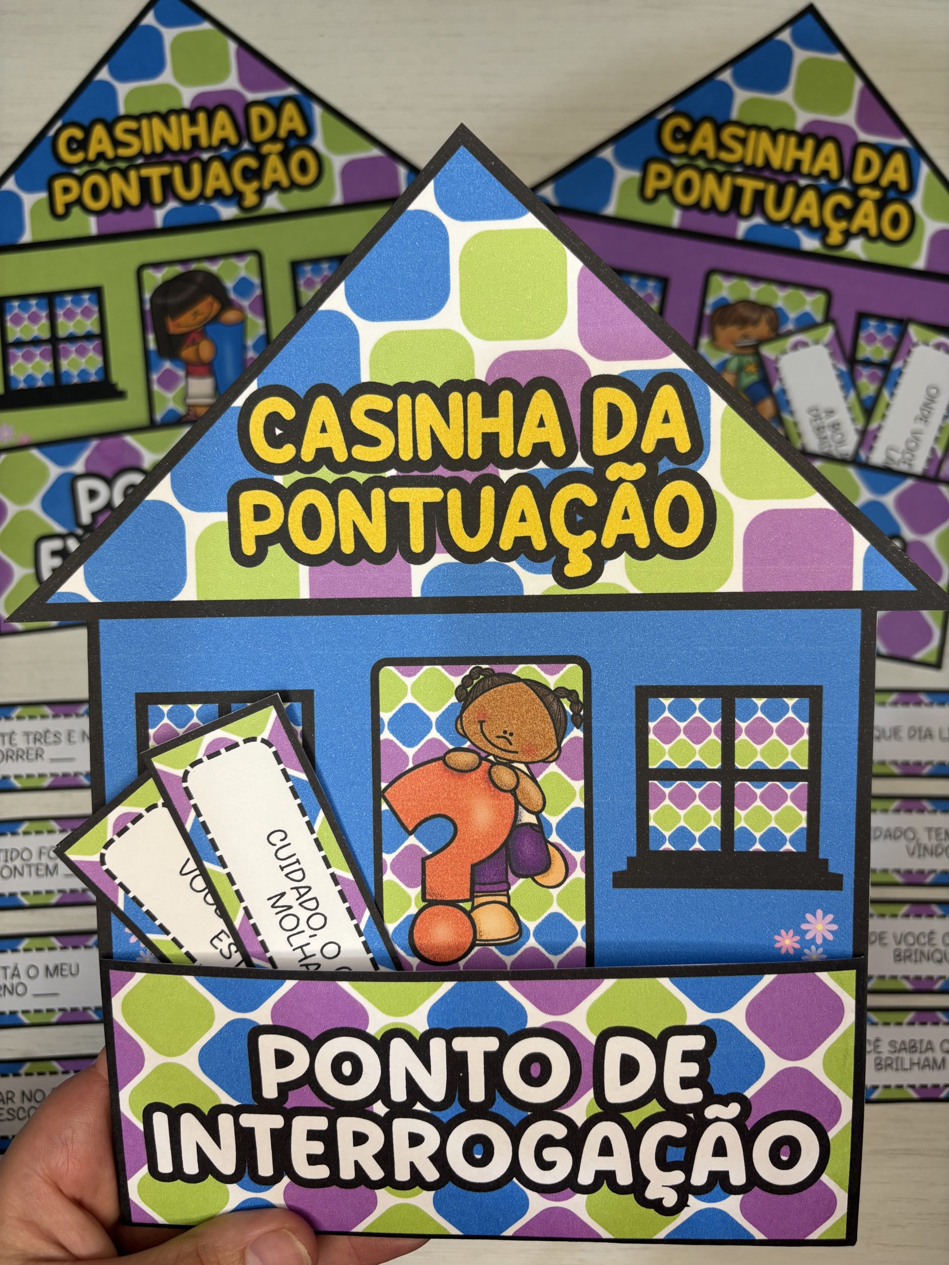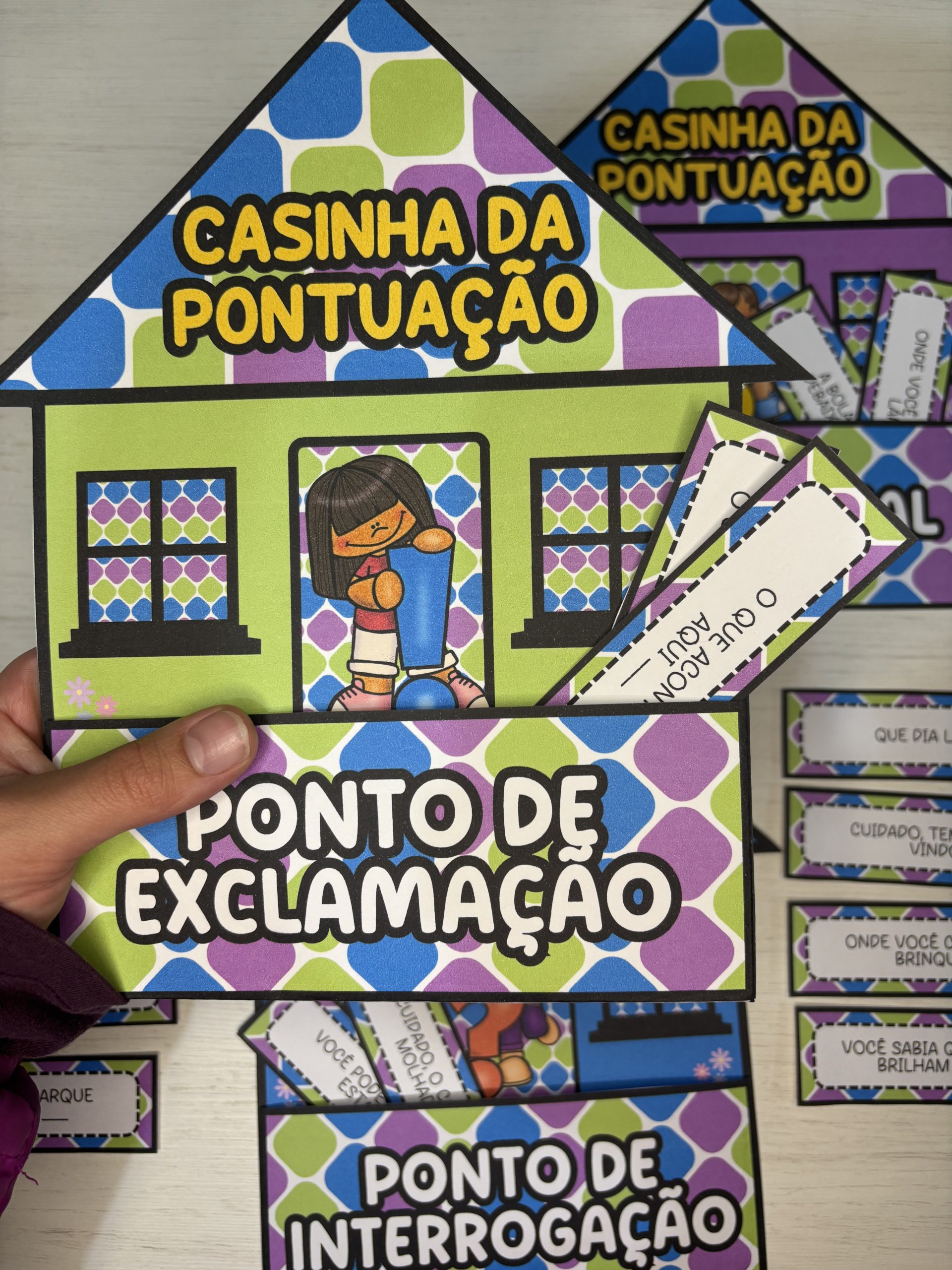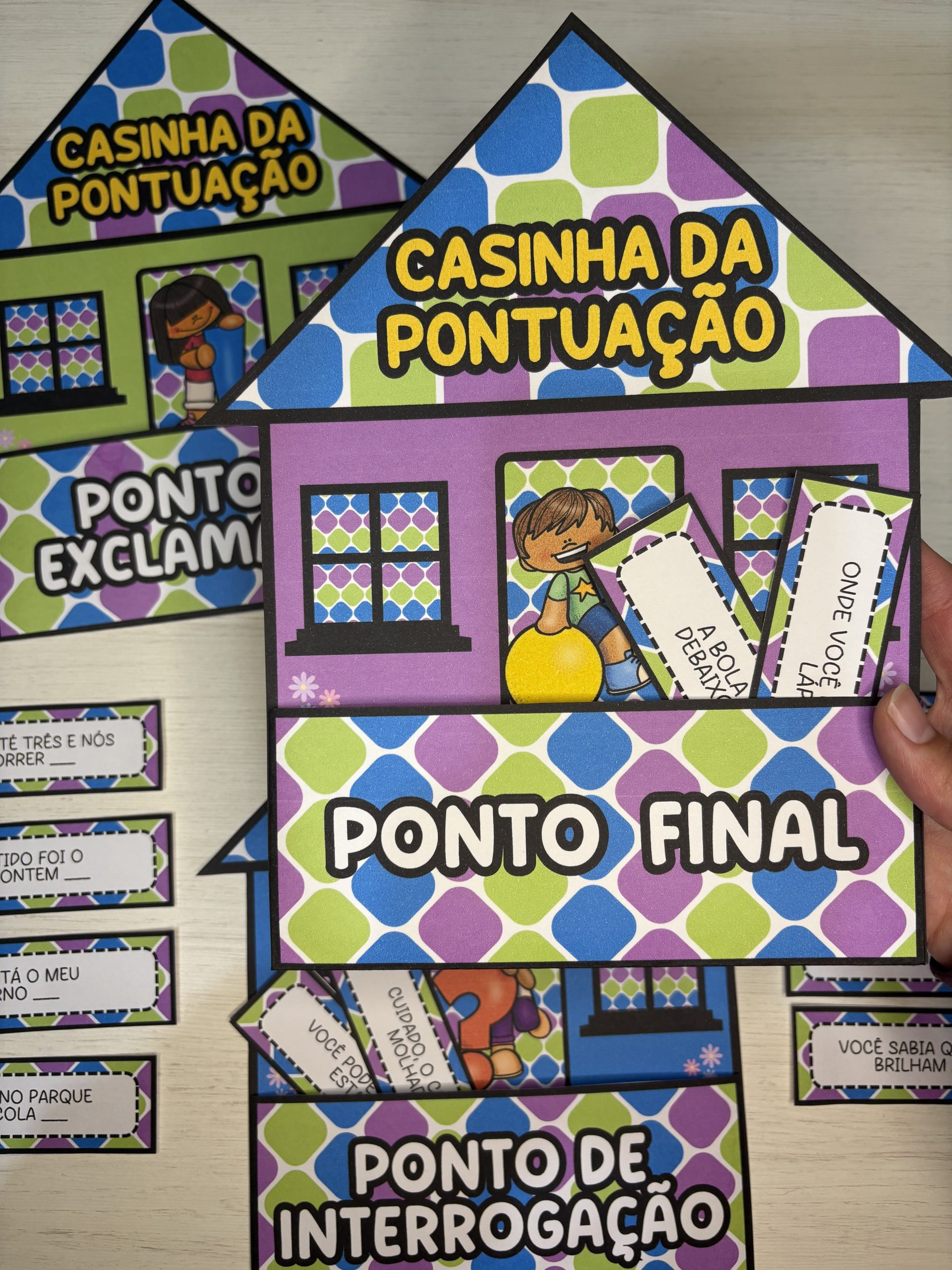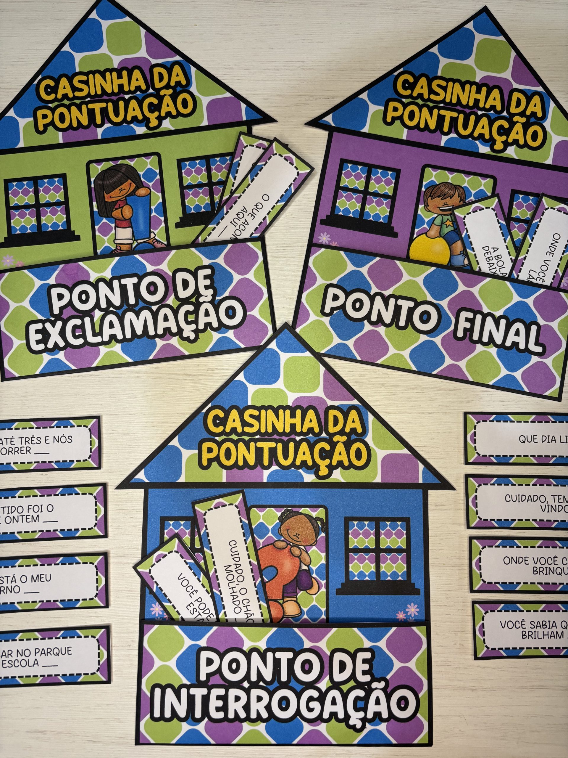 Após a identificação, as crianças podem colocar as fichas em suas respectivas casinhas 🏠🌻💬 Uma forma prática e envolvente de ensinar entonação, sentido e estrutura textual desde cedo.